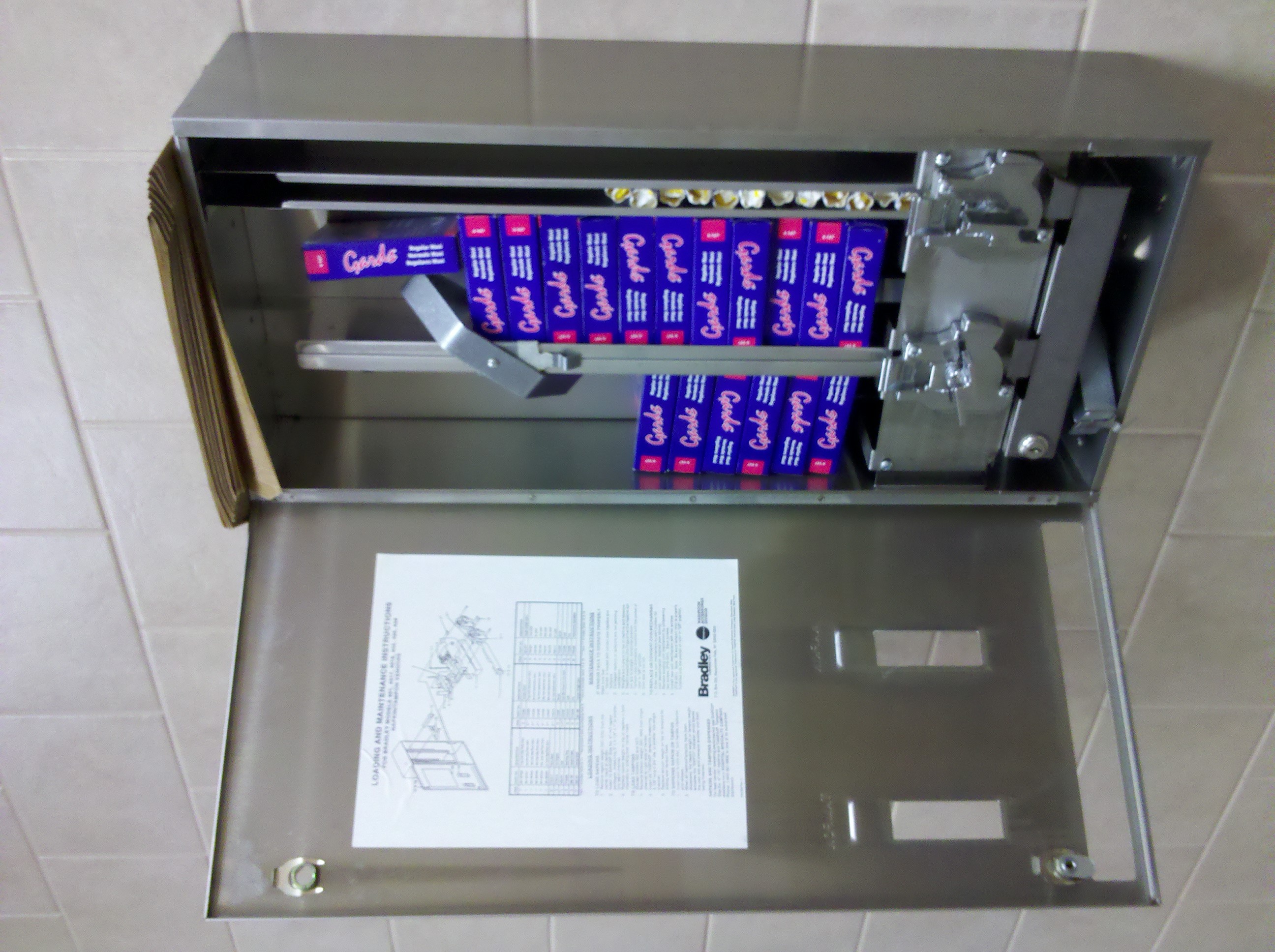 Apparently someone didn’t have the $.25 needed and were badly in need of a diaper feminine pad so they broke in and took one. Maybe they should have looked around the mall first. You can sometimes find a quarter or candy bar lying about…