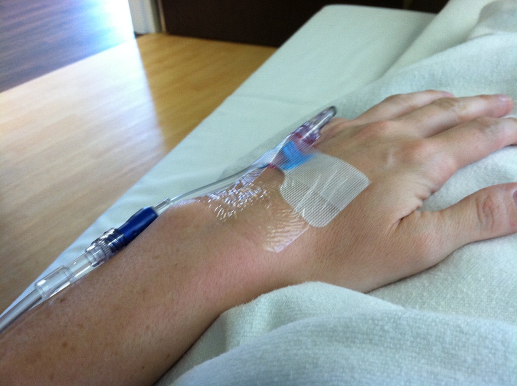 Then it was time to change in to my lovely gown and get prepped. These gowns are actually very nice. They’re thicker, warm and even have a hole in them that can attach to a blower so that if you do get cold, they can pump warm air in. Nice! The nurse put my IV in, attached a heart rate monitor and checked my vitals.