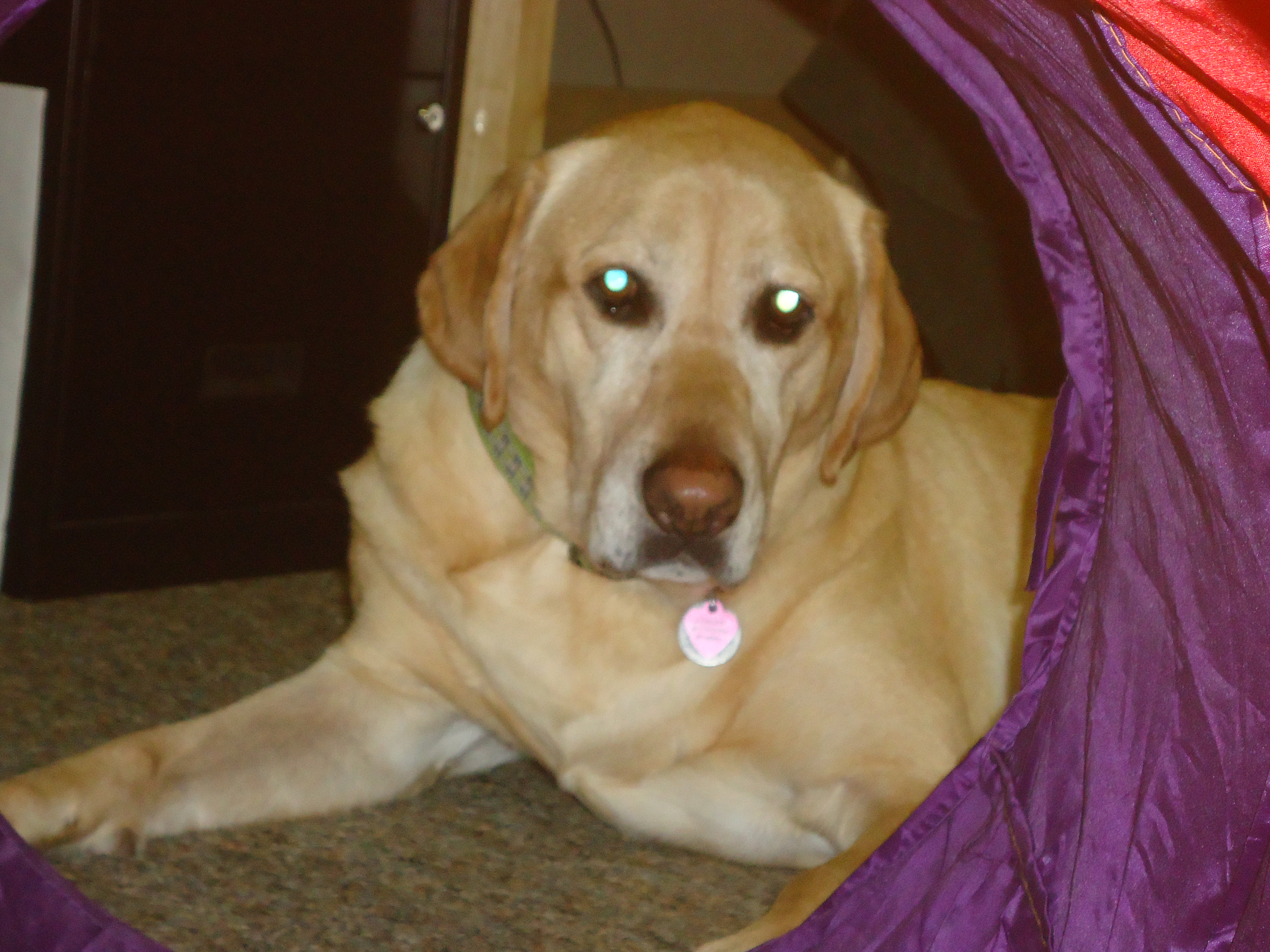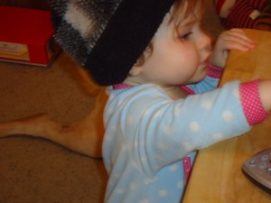 At one point I had to, ehem, use the bathroom. I made sure all the rooms were closed off so that Munchkin couldn’t wander away and then went in to the bathroom, leaving the door open so I could see and hear stuff (all I could see was the hallway right outside the door). Right after I sat down, I see Samson walk by the door toward the end of the hallway and I hear him lay down (he usally does that with a big sigh or grunt).  Pretty soon Isabella goes streaking by, headed in the same direction as the dog. I hear some noises including evil laughter and shrieks, then I see a lone woobie go rolling by the door. Reminded me of a western or something when you hear a scuffle off camera and then all you see is a cowboy hat rolling in front of the screen. Then, here comes Samson running back the other way, followed by Isabella chasing after him. I hear more scuffles in the living room and then Samson comes to the door carrying a deflated volleyball. I was hoping I wouldn’t find my child in an equally deflated state in the living room and alas, everything was fine but it was touch and go there for a minute.