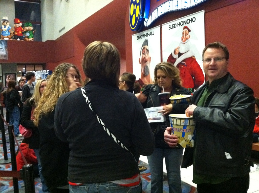 But it didn’t take long for the line to form behind us. We had to wait about 30 minutes before they opened the doors. We passed the time talking to the people around us. Turns out they are from Tekamah, NE which is where CJ lived for about 7 years as a kid. They knew a lot of the same people and it was fun to catch up on how old friends are doing. Finally they let us in and we ran to get our prime viewing spot – middle of the very back row! Perfect!